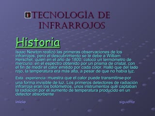 Isaac Newton realizó las primeras observaciones de los infrarrojos en 1800, pero fue William Herschel quien descubrió que el calor podía transmitirse por una forma invisible de luz más allá del color rojo. Los primeros detectores de radiación infrarroja eran los bolómetros, que usaban el aumento de temperatura para medir la radiación infrarroja.