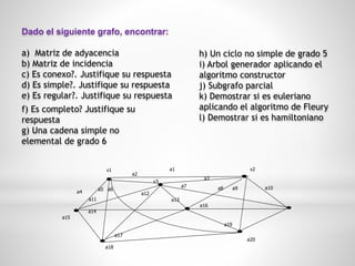 Este documento presenta un problema sobre grafos que incluye encontrar la matriz de adyacencia y de incidencia de un grafo dado, determinar si es conexo, simple, regular, completo, y aplicar varios algoritmos como encontrar un ciclo no simple de grado 5, un árbol generador, un subgrafo parcial, y demostrar si es euleriano o hamiltoniano. También pide resolver un segundo problema sobre un grafo dirigido que implica encontrar su matriz de conexión, una cadena no simple no elemental, un ciclo simple, y demostrar si es fuertemente conexo