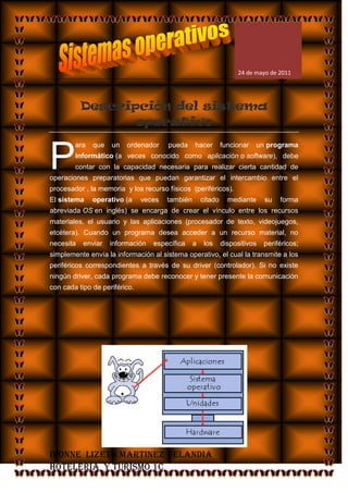 El documento describe las funciones principales de un sistema operativo, incluyendo la administración de recursos como la memoria y los procesadores, la gestión de entrada/salida, la ejecución de aplicaciones, y la autorización de acceso. También describe los componentes clave de un sistema operativo como el núcleo y el intérprete de comandos.
