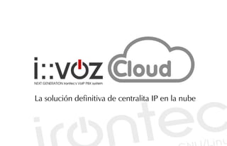 i::voz-ng cloud es una solución de centralita virtual de telefonía 100% IP en la nube, que ofrece características avanzadas como escalabilidad, fácil administración y bajo coste de implementación. Permite despliegues flexibles y ahorros significativos en costes de llamadas e infraestructura, además de no requerir licencias de software. La solución ha sido adoptada por diversas empresas, mostrando su capacidad para manejar múltiples extensiones y mejorar la eficiencia telefónica.