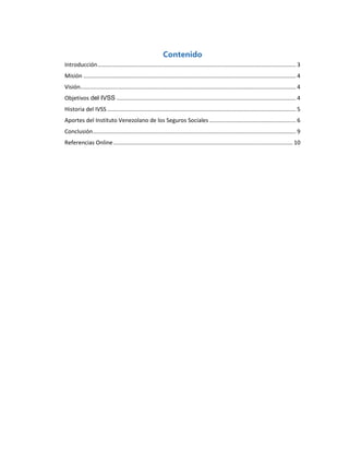 El documento resume la historia y funciones del Instituto Venezolano de Seguros Sociales (IVSS). El IVSS es la institución pública encargada de brindar protección de seguridad social en Venezuela a través de pensiones, atención médica y otros beneficios. Se estableció en 1944 y ha ido expandiendo su cobertura a lo largo del tiempo para incluir pensiones por invalidez, vejez y sobrevivientes, así como indemnizaciones por enfermedad y atención médica integral.