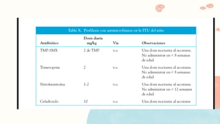 La infección del tracto urinario (ITU) es una de las infecciones bacterianas más frecuentes en pediatría. Es más común en niñas a partir del primer año de vida y en niños en los primeros 3 meses. El agente causal más frecuente es E. coli. Los síntomas incluyen fiebre, dolor abdominal y cambios en la orina. El diagnóstico se realiza mediante análisis de orina y urocultivo. El tratamiento consiste en antibióticos por vía oral de 10-14 días.