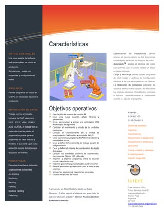 Este documento describe un curso de simulación y programación offline con RobotStudio. El curso capacitará a los estudiantes para realizar simulaciones y programaciones offline, lo que permitirá verificar el alcance y acceso del robot antes de la producción real para reducir riesgos y acelerar los tiempos de implementación de nuevos productos. RobotStudio es una herramienta líder que permite programar robots de manera virtual para optimizar instalaciones de manera segura y paralela a la producción real.