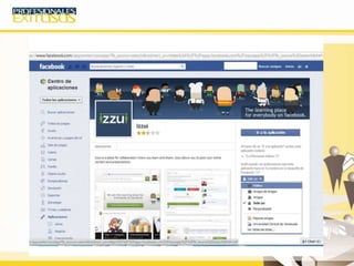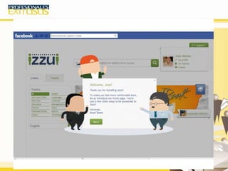 Izzui es una plataforma de aprendizaje en Facebook que permite a las empresas capacitar a clientes y colaboradores, aumentando el compromiso y la lealtad a la marca. Con un mercado potencial de más de 1.100 millones de usuarios, permite crear y compartir cursos de manera gratuita o premium. Además, resalta la necesidad de innovar en el aprendizaje para personalizar y hacer más efectivo el contenido educativo.