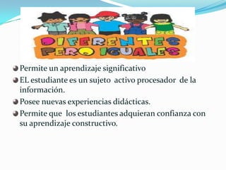 Este documento discute los fundamentos pedagógicos de un aprendizaje significativo. Un buen docente guía a los estudiantes hacia el conocimiento orientándolos a fuentes donde pueden encontrarlo. Los estudiantes son sujetos activos que procesan nueva información a través de experiencias didácticas que les permiten adquirir confianza en su aprendizaje constructivo. El educador es el eje del proceso y debe convertir a los estudiantes en personas analíticas y seguras de sí mismas a través de la creación, el trabajo y la experi