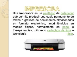 Este documento describe los diferentes tipos de impresoras, incluyendo impresoras de tóner, inyección de tinta, tinta sólida, impacto, matriz de puntos, sublimación de tinta y trazador de imagen. También explica conceptos como la velocidad de impresión, memoria de las impresoras, conexión de impresoras y el uso de cartuchos, tinta y papel.