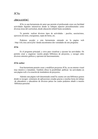 El documento describe JClic, una herramienta gratuita que permite a los profesores crear fácilmente actividades interactivas digitales para usar en el aula. JClic incluye dos programas, JClic y JClic Author, donde JClic Author se utiliza para crear y editar proyectos y JClic para visualizar y ejecutar las actividades. Además, la herramienta ofrece acceso a una biblioteca en línea con cientos de actividades creadas por otros educadores de todo el mundo.