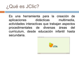 JClic es una herramienta para crear actividades didácticas multimedia desde educación infantil hasta secundaria. Permite siete tipos de actividades como asociaciones, juegos de memoria, puzzles y respuestas escritas. Incluye tres aplicaciones: Jclic para ver actividades, Jclic author para crearlas de forma visual e intuitiva, y Jclic reports para gestionar resultados.