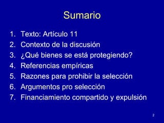 Este documento discute la prohibición de la selección de alumnos en colegios subvencionados según la Ley General de Educación chilena. Presenta los argumentos a favor y en contra de permitir la selección. Los argumentos contra la selección son que inhibe la mejora educativa, segmenta socialmente a los estudiantes y limita la libertad de elección para familias pobres. Los argumentos a favor son que preserva la particularidad del proyecto educativo de algunos colegios y promueve la meritocracia. El autor concluye que la no se