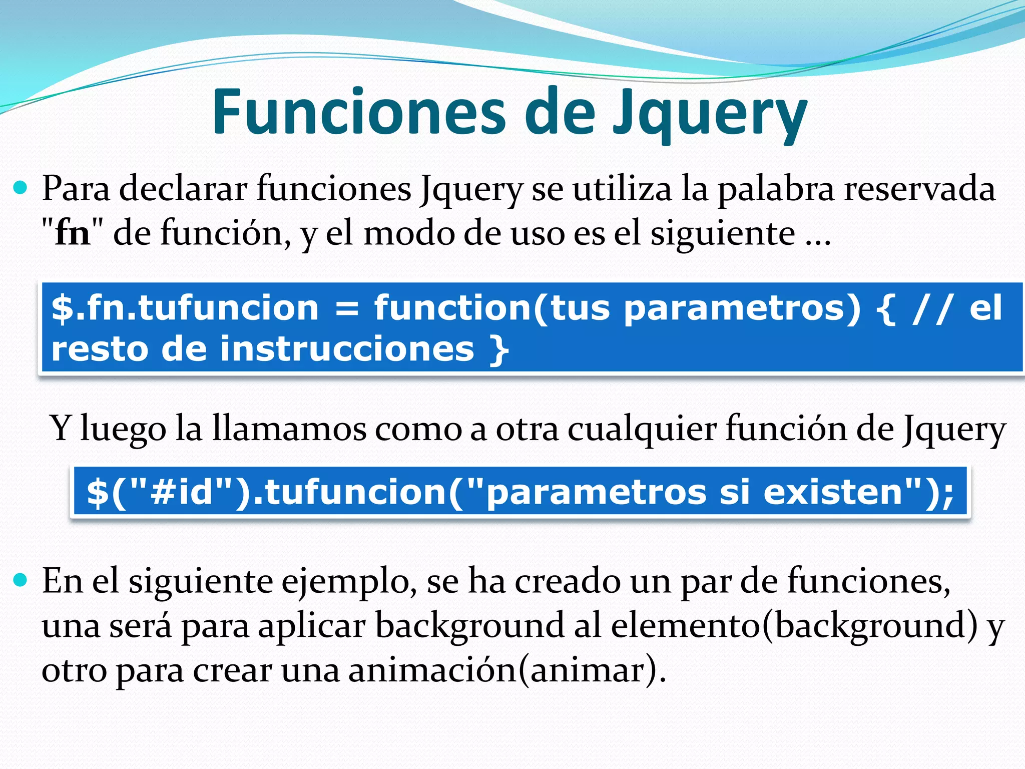 Este documento describe cómo crear funciones personalizadas en jQuery. Explica cómo declarar funciones jQuery usando "fn", cómo agregar parámetros opcionales y valores predeterminados, y cómo usar callbacks para ejecutar código después de que una función haya terminado. También incluye ejemplos de cómo cambiar el fondo, agregar animaciones y estilos a elementos, y cómo crear plugins jQuery flexibles con opciones y callbacks.