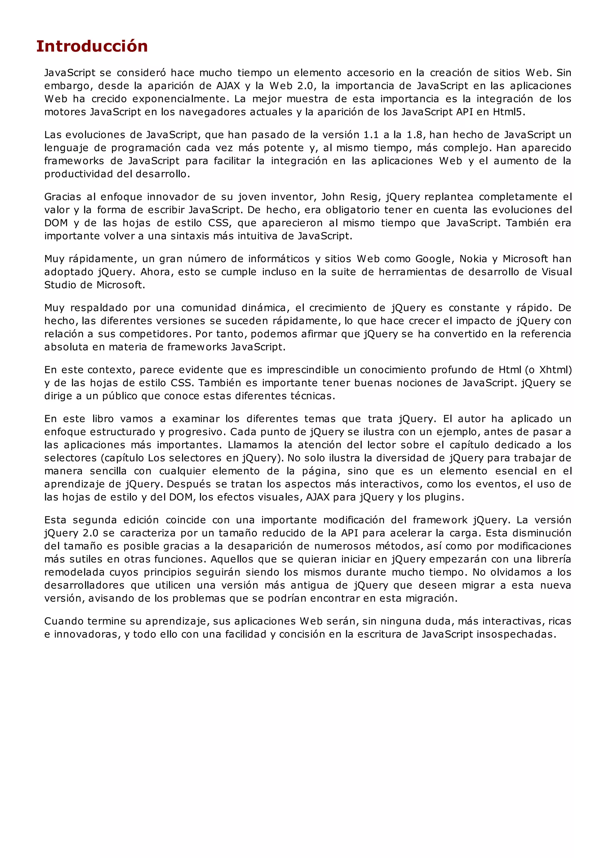 Este documento describe un libro sobre el framework JavaScript jQuery. Explica que jQuery simplifica la escritura de JavaScript al facilitar el acceso y manipulación de elementos HTML. La segunda edición coincide con la nueva versión jQuery 2.0, que se caracteriza por un tamaño reducido para acelerar la carga eliminando métodos obsoletos. El libro cubre temas como selectores, eventos, efectos y plugins para crear aplicaciones web más interactivas.