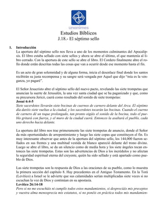 Este documento resume el capítulo 8 del libro de Apocalipsis sobre la apertura del séptimo sello. Se describe un silencio en el cielo tras abrirse el sello, seguido de la aparición de siete ángeles con siete trompetas. Un ángel toma incienso de un altar para añadirlo a las oraciones de los santos, las cuales son elevadas a Dios. Finalmente, los siete ángeles se preparan para tocar sus trompetas.