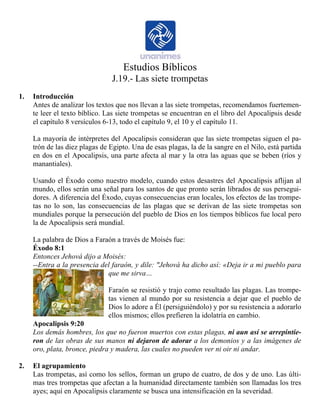 Este documento resume las siete trompetas mencionadas en el libro del Apocalipsis. Explica que las primeras cuatro trompetas traen desastres ambientales que afectan a un tercio de la tierra, el mar, los ríos y el cielo. Las trompetas cinco y seis afectan directamente a la humanidad con langostas demoníacas y jinetes que matan a un tercio de la población. A pesar de esto, la humanidad no se arrepiente. La séptima trompeta anuncia el fin del mundo y