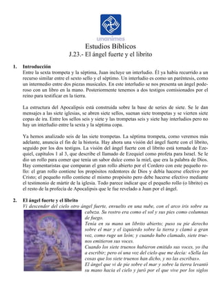 El resumen describe un documento que analiza un pasaje bíblico del Apocalipsis sobre un ángel fuerte con un librito en la mano. Entre la sexta y séptima trompeta, Juan tiene una visión de este ángel que desciende del cielo envuelto en una nube, con un libro abierto en la mano. El ángel jura que cuando suene la séptima trompeta se consumará el misterio de Dios. Juan come el libro que le da el ángel y se le dice que debe profetizar sobre muchos pueblos