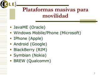 Este documento proporciona información sobre las principales plataformas para la movilidad como JavaME, Windows Mobile, iPhone, Android y BlackBerry. Explica los conceptos clave de J2ME como CLDC, MIDP y perfiles, y describe las clases y APIs más importantes de J2ME como Display, Alert, TextBox y List. También cubre el ciclo de vida de los MIDLets y el proceso de desarrollo de aplicaciones J2ME.