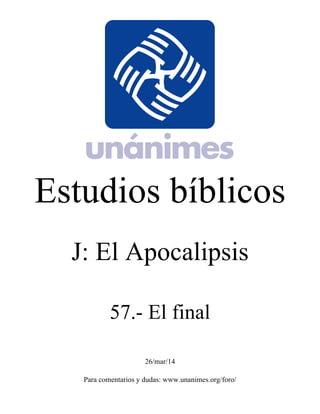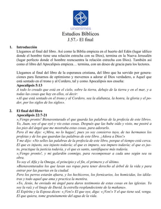 El documento resume el capítulo final del libro bíblico de Apocalipsis. Comienza describiendo cómo el libro empieza y termina en lugares idílicos que representan la relación entre Dios y el hombre. Luego resume las últimas secciones del capítulo 22 de Apocalipsis, en el que Jesús anuncia su pronta segunda venida y ofrece bendiciones a los justos. Termina resaltando que Juan, el autor, enfatiza haber visto y oído estas visiones proféticas.