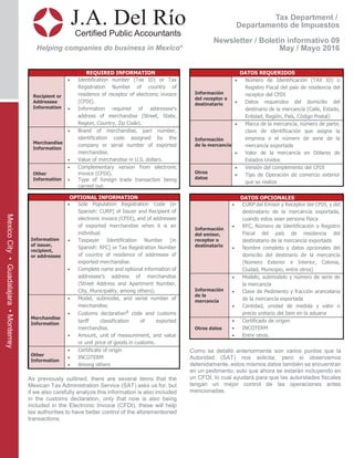 El boletín informa sobre la obligación de emitir un Comprobante Fiscal Digital por Internet (CFDI) para operaciones de comercio exterior a partir del 1 de julio de 2016, detallando la información requerida y opcional tanto para los contribuyentes como para los agentes aduanales. Se mencionan también los procedimientos específicos para exportaciones en consignación y de muestras, así como el manejo del Tax ID para transacciones hacia Estados Unidos. La autoridad fiscal busca modernizar procesos y garantizar el cumplimiento de obligaciones con este nuevo complemento para mejorar el control de operaciones comerciales internacionales.