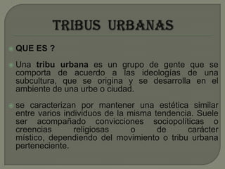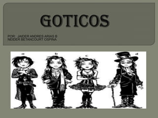 Los góticos son una tribu urbana que se caracteriza por expresarse a través del color negro y el luto. Adoran el arte y se identifican con sentimientos de tristeza y melancolía. Aunque niegan estar ligados a prácticas ocultas, muchos góticos participan en rituales en cementerios o pactos de sangre. La música gótica se originó con bandas como Bauhaus y The Cure en la década de 1980, e influyó en películas de terror con personajes góticos protagónicos.