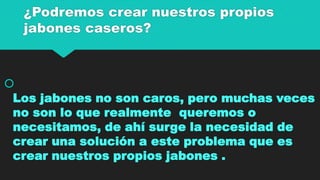 El documento presenta una receta para hacer jabón casero utilizando avena, leche y jabón neutro. Explica los 10 pasos para mezclar estos ingredientes y moldear el jabón, incluyendo calentar la avena y la leche, derretir el jabón neutro a baño maría y mezclar todo para obtener una consistencia espesa antes de verter la mezcla en moldes para que se seque. El autor concluye que aunque los jabones caseros no son igual de buenos que las marcas reconocidas, aún