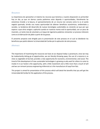 El documento describe un proyecto para producir jabón en gel utilizando aceite vegetal reciclado de las cocinas de la Universidad del Caribe. El proyecto busca aprovechar este residuo para obtener beneficios económicos y ambientales, y crear conciencia sobre su correcta disposición. Se estimará la cantidad de aceite producido y se establecerá el proceso de fabricación de jabón.