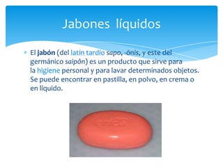 El documento describe los diferentes tipos de jabones, incluyendo jabones sólidos y líquidos. Explica los materiales y el procedimiento para hacer jabones sólidos caseros, incluyendo cortar la pasta de jabón, derretirla en el microondas, añadir colorantes y esencias, verter la mezcla en moldes y dejarla enfriar. El autor concluye que elaborar jabones en casa es una forma económica y práctica de obtener un artículo de higiene, y recomienda hacerlo con la super