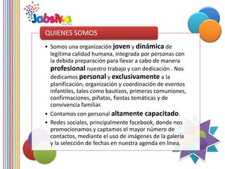 Somos una organización especializada en la planificación y coordinación de eventos infantiles, ofrecida por un equipo profesional y capacitado. Nos enfocamos en adaptarnos a las necesidades de nuestros clientes, ofreciendo calidad y precios accesibles, mientras competimos como líderes en el noreste de la república. Nuestro objetivo es aumentar la cantidad de eventos mensuales, construir una marca reconocida y garantizar la satisfacción del cliente a través de un servicio eficiente y original.