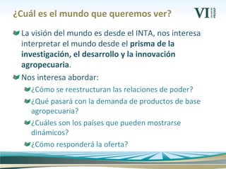 El documento analiza las tendencias globales en población, economía y comercio hacia 2030. Predice que Asia, África y América Latina serán las regiones más dinámicas, impulsadas por el rápido crecimiento de China, India y otros países emergentes. También anticipa una economía mundial más multipolar, con Estados Unidos perdiendo su hegemonía y China emergiendo como una gran potencia económica y política.