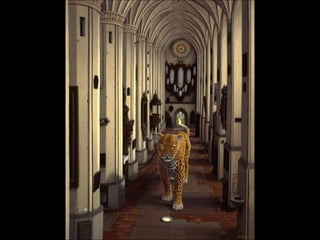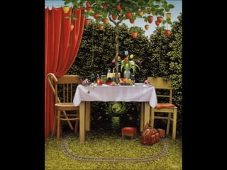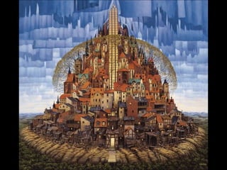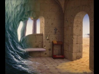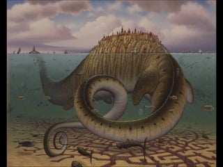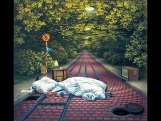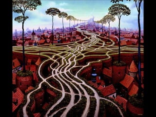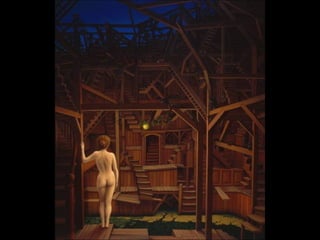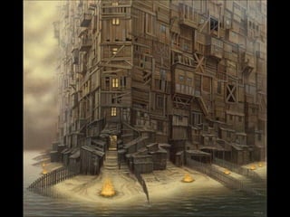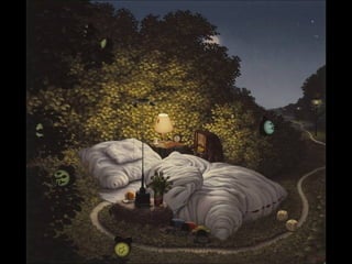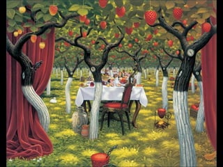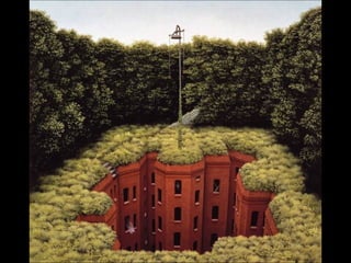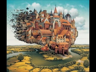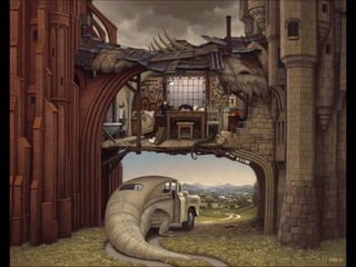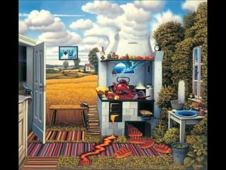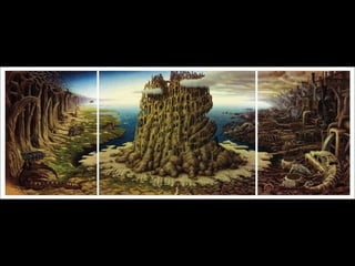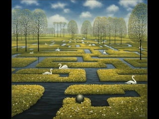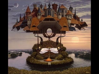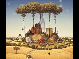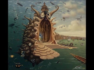 Este documento presenta al pintor polaco Jacek Yerka, conocido por sus paisajes surrealistas que representan mundos de sueños y fantasía. Nació en 1952 en el norte de Polonia y estudió arte, desarrollando un estilo que combina colores vibrantes, lugares de la infancia y seres fantásticos. Sus cuadros transportan al espectador a islas imaginarias y mundos marinos llenos de misterio.