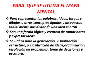 Un mapa mental es un método efectivo para extraer y memorizar información mediante la representación radial de palabras, ideas, tareas y otros conceptos relacionados con una idea central. Los mapas mentales son una forma lógica y creativa de tomar notas y expresar ideas, y se utilizan para generar, visualizar, estructurar y clasificar información, organizar tareas, resolver problemas y tomar decisiones.