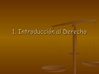 El documento introduce el tema del derecho. Explica que el derecho es el conjunto de normas que regulan el comportamiento individual con efectos sociales y las relaciones entre las personas. Además, señala que el derecho es a la vez mutable y permanente, y que su objetivo final es lograr la justicia. Por último, distingue entre derecho positivo, que es válido en un lugar y momento determinados, y derecho natural, que es atemporal y válido en todo lugar.