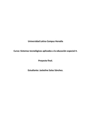 Este documento presenta un proyecto final para un curso sobre sistemas tecnológicos aplicados a la educación especial. El proyecto, titulado "Jugando con los colores", tiene como objetivo enseñar los colores a niños con déficit atencional de manera creativa mediante el uso de programas de computadora. El documento incluye el marco teórico sobre el déficit atencional y el software Hot Potatoes que se utilizará para crear ejercicios educativos.