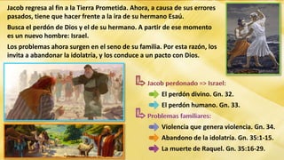 Jacob regresa a la Tierra Prometida y se enfrenta a la ira de su hermano Esaú. Busca el perdón de Dios y de Esaú. A pesar de los problemas en su familia, invita a abandonar la idolatría y hacer un pacto con Dios. Más tarde, Siquem viola a su hija Dina y sus hijos Simeón y Leví toman venganza, lo que causa más problemas. Jacob intenta reconducir a su familia a una relación con Dios.