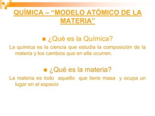Este documento presenta información sobre los modelos atómicos a través de la historia, incluyendo los modelos de Thomson, Rutherford y Bohr. Explica que Thomson propuso que el átomo consiste en una esfera positiva con electrones incrustados, mientras que Rutherford determinó que el átomo tiene un núcleo pequeño y denso rodeado por electrones a distancia. Finalmente, Bohr sugirió que los electrones orbitan en niveles de energía fijos alrededor del núcleo.