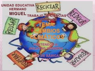 El documento describe cómo los cambios climáticos ocurren naturalmente a lo largo del tiempo pero que actualmente las actividades humanas están alterando la composición atmosférica y acelerando el calentamiento global; también explica que la atmósfera mantiene el equilibrio térmico de la Tierra al absorber la energía infrarroja que emana de la superficie.
