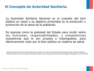 El documento describe la autoridad sanitaria en Chile. Explica que la autoridad sanitaria nacional es responsable de proteger la salud pública y se expresa a través del poder del estado para regular y fiscalizar el sistema de salud. También resume la historia de la autoridad sanitaria en Chile y los desafíos que enfrentaba antes de la reforma de salud de 2005, como la dispersión de funciones y falta de regulación del sector privado.