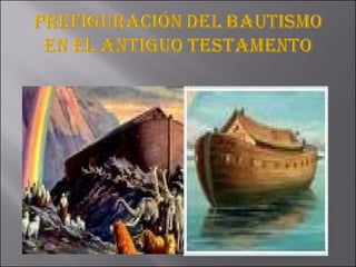 El documento describe el significado y la importancia del sacramento del bautismo según las Escrituras. Explica que el bautismo simboliza el nacimiento a la fe y la regeneración espiritual a través de Cristo. También señala varias prefiguraciones del bautismo en el Antiguo Testamento como el arca de Noé y el paso del mar Rojo, y describe el papel del bautismo de Juan Bautista en preparar el camino para Cristo.