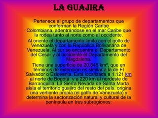 La Guajira se encuentra en la región Caribe de Colombia y limita con Venezuela. Tiene una superficie similar a El Salvador o Eslovenia. Su clima es cálido, con temperaturas entre 27-30°C, y su economía depende del comercio, la minería, el turismo y los servicios. La región ha estado habitada por grupos indígenas como los wayuu y fue disputada entre las gobernaciones de Santa Marta y Venezuela durante la colonia.