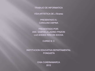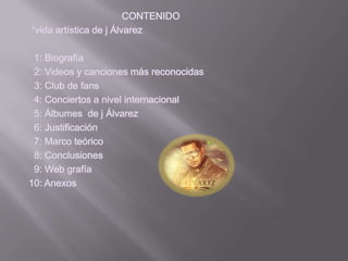 Este documento resume la trayectoria musical de J Álvarez, incluyendo los detalles de sus primeros álbumes lanzados en 2011 y 2012. En 2011 lanzó su álbum debut "Otro Nivel de Música" con 20 canciones que incluyen éxitos como "La Pregunta" y "Junto Al Amanecer". En 2012 lanzó el álbum "Otro Nivel de Música Reloaded" y se preparó para presentaciones en vivo y futuros lanzamientos. El documento también proporciona contexto sobre su carrera musical y