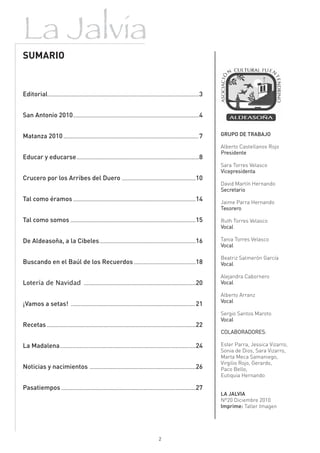 Este documento resume las celebraciones de la fiesta de San Antonio y la Matanza de 2010 en Aldeasoña. En la fiesta de San Antonio hubo procesión y misa con niños llevando las andas, aunque llovió. Hubo concurso de sombreros ganado por Jaime. En la Matanza se celebró el décimo aniversario de la asociación cultural Fuentendrino y hubo concurso de pinchos ganado por tres jóvenes con una coreografía de Michael Jackson.