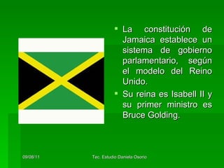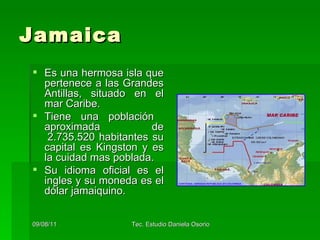 Jamaica es una isla en el Caribe cuya capital es Kingston. Tiene una población de aproximadamente 2.7 millones de habitantes y su idioma oficial es el inglés. La economía se basa en el turismo, la producción de algodón y la extracción de bauxita, así como la música de Bob Marley. La cultura jamaiquina es rica y ha dado origen a géneros musicales como el reggae; el cristianismo y el rastafarismo son las principales religiones.