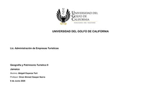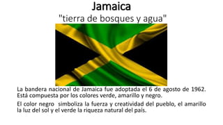 Este documento proporciona información sobre Jamaica, incluyendo su bandera, escudo, capital, división política, idiomas, clima, religión, independencia, moneda, cultura, gastronomía, transporte y principales atracciones turísticas como la finca de ron Appleton Estate. Jamaica obtuvo su independencia del Reino Unido en 1962 y su economía se basa principalmente en el turismo, el aluminio y las remesas.