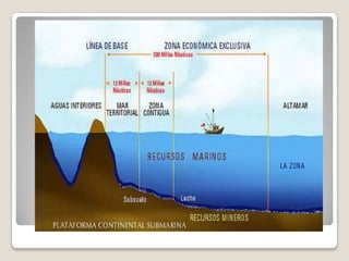 La Convención de Jamaica de 1982 establece la soberanía de los estados sobre sus aguas territoriales y zonas adyacentes, así como normas para el uso de los océanos y mares. Define zonas como la zona económica exclusiva de 200 millas náuticas y la plataforma continental. También regula el paso inocente, los derechos de los estados sin litoral, y establece mecanismos para la solución de controversias relacionadas con el derecho del mar.