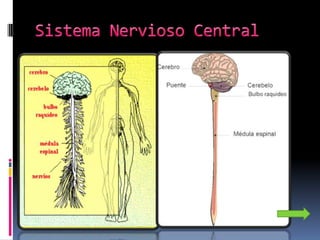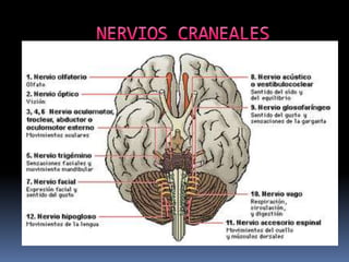 El documento resume los conceptos clave del sistema nervioso, incluyendo las neuronas, los nervios y las partes del sistema nervioso. Explica que las neuronas son las células fundamentales del sistema nervioso y describen sus partes principales. También describe los dos sistemas nerviosos principales - el sistema nervioso central y el sistema nervioso periférico - y sus funciones.