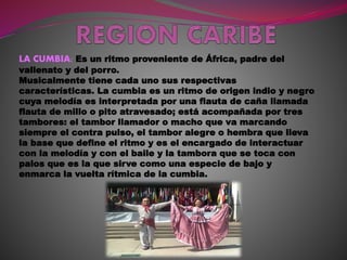 El documento describe varios ritmos y danzas tradicionales de diferentes culturas, incluyendo sus orígenes, características musicales y de baile. Se mencionan ritmos como la cumbia (de origen indio y negro), el currulao (con instrumentos como la marimba), el bambuco (aire mestizo colombiano), el zuyuco (danza huitoto con tambores), el joropo (baile de parejas venezolano) y la samba (baile brasileño de origen africano).