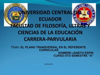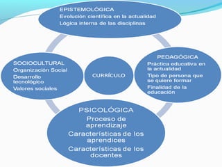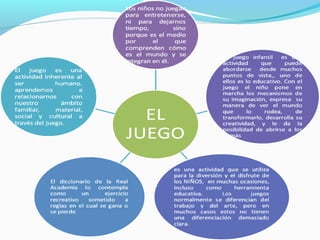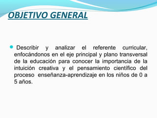 El documento describe los componentes clave del referente curricular, incluidos los objetivos generales y específicos, la definición de currículo, los ejes transversales, y los elementos que conforman el eje principal como el aprendizaje, la personalidad, la creatividad y el desarrollo integral del niño. Resalta que la educación es un derecho que busca la transformación social y que el currículo orienta las actividades en el aula.