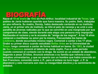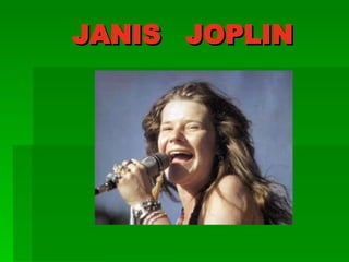 Janis Joplin nació en 1943 en Texas. Tuvo una juventud rebelde y se unió a una pandilla radical. Comenzó a cantar blues en bares de Luisiana a los 17 años. En los años 60 triunfó en San Francisco pero cayó en el alcoholismo y la heroína. En 1970 grabó su último álbum "Pearl" pero murió de una sobredosis de heroína a los 27 años, alcanzando la fama póstuma.