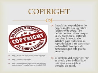 El documento define los conceptos de copyright, derechos de autor, propiedad intelectual e insertación de páginas web. Define copyright como el derecho que reconoce la ley al autor para autorizar la reproducción de su obra y participar en los beneficios. Define derechos de autor como el reconocimiento estatal a creadores de obras literarias y artísticas, incluyendo derechos patrimoniales y morales. Define propiedad intelectual como toda creación de la mente humana como inventos, obras y marcas. Define la forma correcta de citar una p