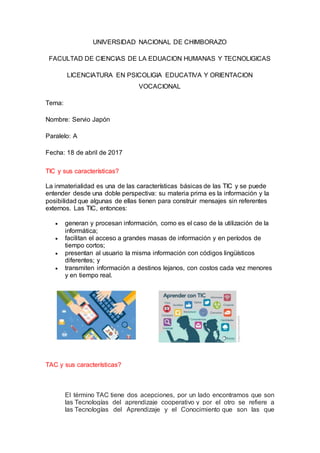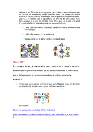 El documento resume las características de las Tecnologías de la Información y la Comunicación (TIC), Tecnologías del Aprendizaje y el Conocimiento (TAC) y Tecnologías del Empoderamiento y la Participación (TEP). Las TIC procesan y transmiten información de forma inmaterial y a bajo costo. Las TAC se enfocan en facilitar un aprendizaje significativo utilizando metodologías pedagógicas. Las TEP promueven la participación ciudadana a través de redes sociales en temas de política, soc