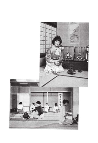 Este documento presenta varias expresiones comunes en japonés para saludos, preguntas sobre el estado de salud, agradecimientos y disculpas. Incluye explicaciones gramaticales breves sobre el orden de las palabras y partículas en el idioma japonés.