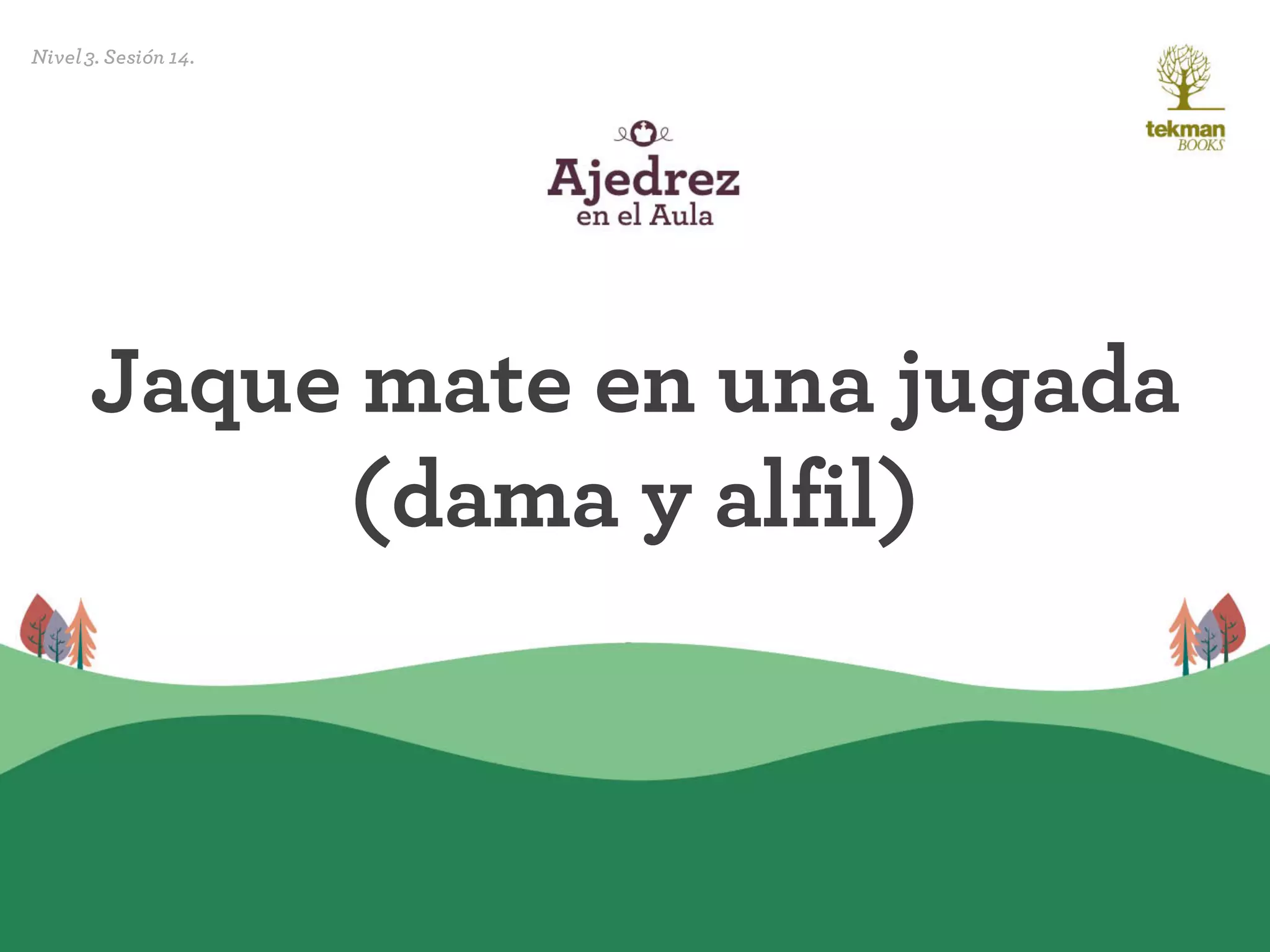 El documento presenta varios ejemplos de jaque mate en una jugada usando una dama y un alfil. En cada ejemplo, las negras o las blancas dan jaque mate moviendo su dama a una casilla donde el rey contrario no puede capturarla porque está defendida por el alfil. El documento concluye con una partida de ejemplo que termina en jaque mate para las blancas.